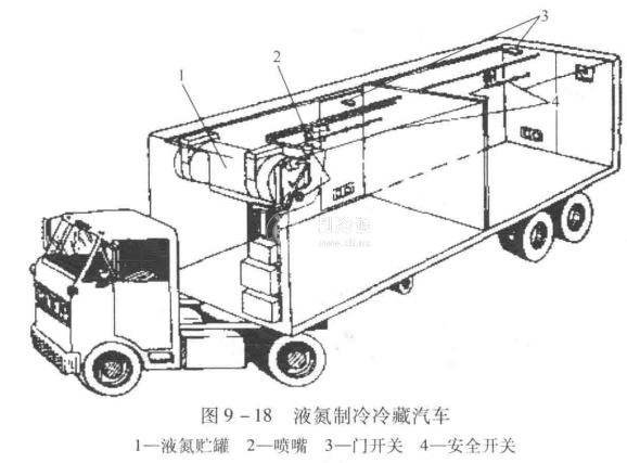 液氮制冷裝置主要由液氮容器、噴嘴及溫度控制器組成。如圖9-18所示。液氨容器通常裝在車廂內,大型車的液氨容器裝在車體下邊。液氨容器進行真空一多層隔熱處理。車廂內部從前到后沿車廂頂部居中布置一條液氨管路,其上裝有若干噴嘴。由液氮容器供給的液氮由噴嘴噴出,氣化過程中吸收大量熱量,使車廂降溫。根據廂內溫度,恒溫器自動地打開或關閉液氨通路上的電磁閥,調節液氮的噴射,使廂內溫度維持在規定溫度±2℃范圍內。液氮氣化時,容積膨脹600倍,即使貨堆密實,沒有通風設施,也能使氮氣進人貨堆內,使車內溫度達到均勻。為了防止車廂內壓力升高,車廂上部裝有排氣管,供氮氣排出車外。由于車廂內空氣被氮氣置換,長途運輸冷卻水果、蔬菜時,可能對果蔬的呼吸作用產生一定影響。運輸凍結食品時,氮氣置換了空氣,有助于減少食品的氧化。由于運輸時間一般不很長,減少食品氧化的優點并不明顯。