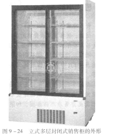 緊靠立式多層封閉式冷凍銷售柜柜體的后壁,有冷空氣循環用風道,冷空氣在風機作用下強制地在柜內循環。柜門為雙層或三層玻璃,玻璃夾層中的空氣具有隔熱作用。由于玻璃對紅外線的透過率低,雖然下柜門很大,傳入的輻射熱并不多,直接被食品吸收的輻射熱就更少。圖9-24為立式多層封閉式銷售柜的外形圖。