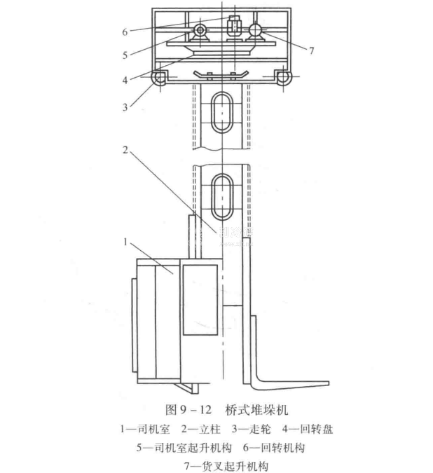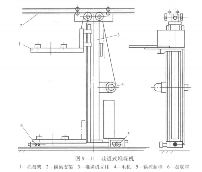 巷道式堆垛機是由叉車和橋式堆垛機演變而來的。它由運行機構、起升機構、載貨臺(裝有存取貨機構)、機架(車身)、電氣設備和安全保護裝置6部分組成,如圖9-11所示。