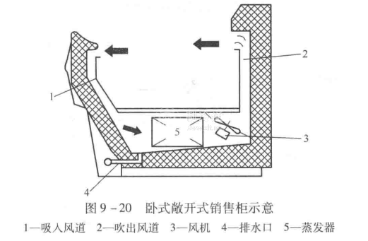 圖9-20是臥式銷售柜的一種。這種銷售柜,上部敞開,開口處有循環冷空氣形成的空氣幕,防止外界熱量侵入柜內。由圍護結構傳入的熱流也被循環冷空氣吸收,對食品沒有直接影響。對食品影響較大的是由開口部侵入的熱空氣及輻射熱。柜內最表層食品的表面溫度高于空氣幕溫度。高出的度數與空氣幕的空氣流量及溫度有關,一般為5~10℃。