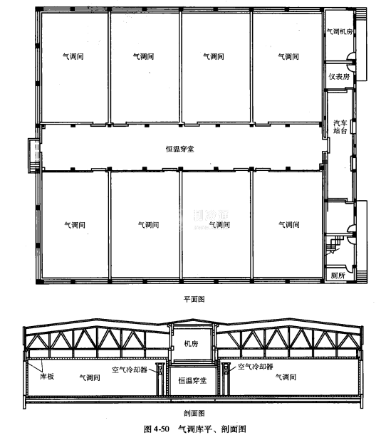氣調(diào)庫(kù)第一期工程主要先建造800t氣調(diào)庫(kù)(不包括挑選、包裝間),其平剖面布置見(jiàn)圖4-50.平面圖上示出八個(gè)氣調(diào)間及恒溫穿堂,氣調(diào)設(shè)備置于氣調(diào)機(jī)房,電腦控制設(shè)備置于儀表房?jī)?nèi),汽車(chē)站臺(tái)為封閉式,溫度保持在5~7℃。