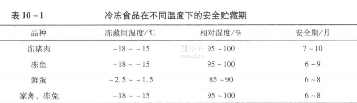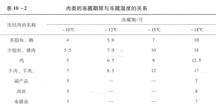對特殊要求或出口的食品,應(yīng)按照合同規(guī)定辦理。貯藏安全期系指質(zhì)量良好的食品從初次冷加工開始計算,到不失去商品價值的時間,其長短與食品經(jīng)歷的溫度有很大的關(guān)系。部分冷凍食品在不同溫度下的安全貯藏期見表10-1;肉類的凍藏期限與凍藏溫度的關(guān)系見表10-2。