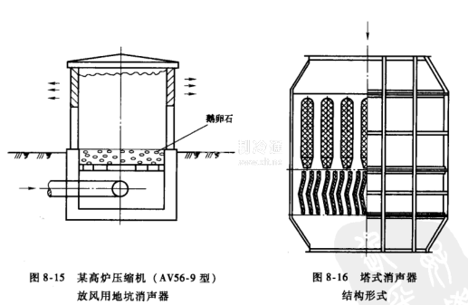 3)放風消聲器。放風消聲器人口處噪聲功率達150~160dB(A),因此要求消聲器的降噪值為50dB(A)左右。
