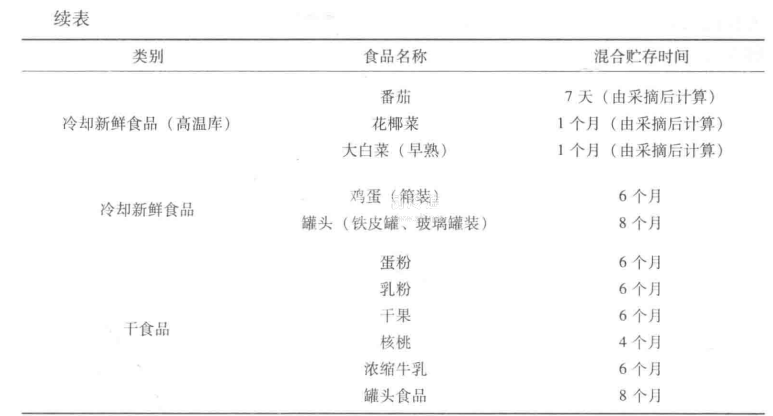 對于已經入庫的食品,需要按照食品的不同種類和不同的冷加工最終溫度分別存放。如果冷藏間較大,而某種食品數量較少,單獨存放不經濟時,或冷藏間少而需要貯存的食品種類較多,不可能單獨存放時,可以考慮不同種類的食品混合存放,但應以不互相串味為原則,并應分別堆碼。具有強烈氣味的食品如魚蒜、蔥、乳酪等和貯藏溫度不一致的食品,應嚴格禁止混放在一個冷藏間內。可以混合堆放的食品見表10-3中所列的六大類。注意同類的食品可以混合貯藏,不同類之間的食品則不能混合貯藏。未列入表中的食品應單獨存放。