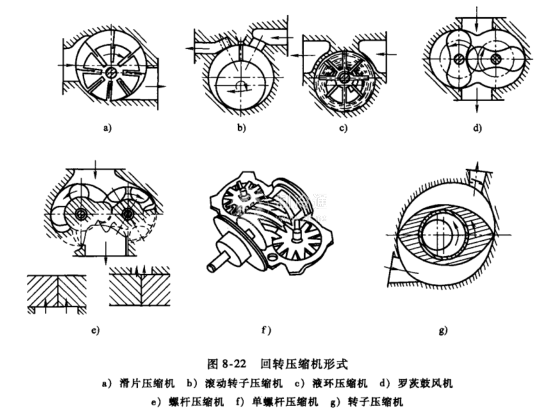 常見的回轉壓縮機形式如圖8-22所示。回轉壓縮機按運轉方式,可分為噴油、滴油、干式(無油)三種。