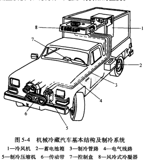 (2)制冷機組與動力裝置分開。大型貨車的制冷壓縮機配備專門的發動機,通常以汽油作燃料,布置在車廂下面;小型貨車的壓縮機與動力裝置共用一臺發動機,制冷能力一殷按車速40km/h設計。為了防止汽車出現機械故障,或在冷藏