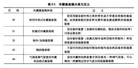 凡具有隔熱的箱壁(包括端壁和側壁)、箱門、箱底和箱頂,能阻止內外熱交換的集裝箱稱之為保溫集裝箱(Thermal Container)。保溫集裝箱是一個總稱,根據中華人民共和國國家標準GB/T7392一1998《系列1:集裝箱的技術要求和試驗方法保溫集裝箱》,保溫集裝箱中常見的冷藏集裝箱分類和定義詳見表5-1。