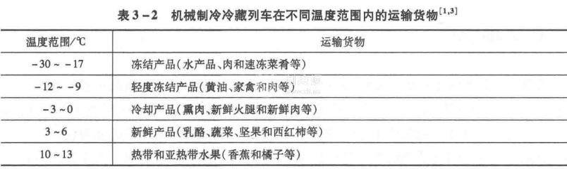 機械制冷冷藏列車內的溫度可以控制在-30~14℃或-20~14℃,各溫度段的可運輸貨物如表3-2所示,車外環境溫度可以達到-45~45℃。
