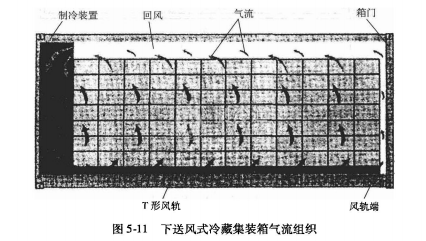 ②在任何情況下不能有直接裸露的T形風(fēng)軌,必須使冷藏箱整個(gè)底部處于被貨物或其他遮蓋物覆蓋的狀態(tài)。在貨物裝截量不足時(shí),在未被貨物包裝箱覆蓋區(qū)域,必須用硬板紙等將底部全部覆蓋住,使送入冷藏箱底部T形風(fēng)軌的冷風(fēng)只能從貨物裝載區(qū)向上流動(dòng),并從貨物內(nèi)部或表面吹過(guò),帶走熱量,形成良好的箱內(nèi)流量循環(huán),下送風(fēng)式冷藏集裝箱氣流組織如圖5-11所示。