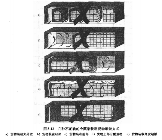 路”。在圖5-12d中,由于不正確地在貨物上部覆蓋了不透風的塑料薄膜等覆蓋物,使氣流“斷路”而無法通過上部回風通道回到制冷裝置。在圖5-12中,貨物裝載高度超過最高貨物裝載線,沒有在貨物上部與冷藏箱頂部之間留下必要的回風通道,從而造成氣流的“斷路”,影響制冷效果。