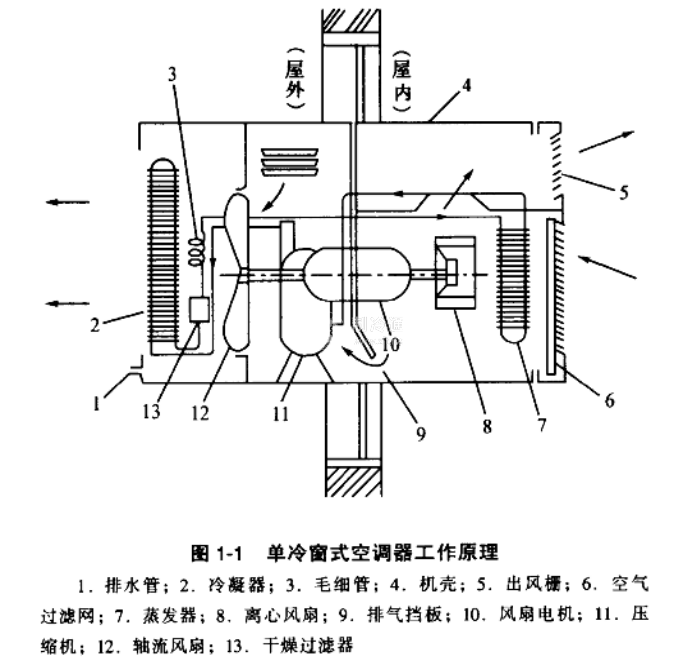 窗式空調器的制冷過程如下:在離心風扇8的作用下,室內濕熱空氣通過進風孔板(空氣過濾網6)進人蒸發器7,蒸發器內的制冷劑R22吸收熱空氣的熱量后變成氣態,同時使空氣降溫。由于蒸發器表面溫度常常低于室內空氣露點,凝結的露水會不斷從翅片表面析出,通過排水管1流出室外,因此還能使空氣除濕;然后,這種經過濾網除塵,又經蒸發器降溫、除濕的潔凈干燥冷風進入離心風扇8,通過出風柵5向室內送風,達到調節室內空氣溫度、濕度的目的。蒸發器中吸熱蒸發的制冷劑R22被壓縮機吸入并壓縮成高溫高壓蒸氣,被排往冷凝器中,軸流風扇12從空調器兩側吸入室外空氣來冷卻冷凝器,并將吸熱后的空氣排往空外,帶走熱量。冷凝器中的制冷劑冷卻成高壓過冷液體,這些液體先經干燥過濾器13過濾,再經毛細管3節流降壓,返回蒸發器,使制冷過程循環進行,保持房間空調所需冷量的要求。