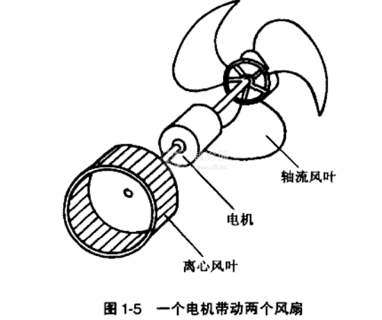 窗式空調(diào)器是一種整體型結(jié)構(gòu)的空調(diào)器,為縮小結(jié)構(gòu)體積,常采用雙軸電機(jī),將室外側(cè)的軸流風(fēng)扇和室內(nèi)側(cè)的離心風(fēng)扇共用一個(gè)電機(jī),結(jié)構(gòu)見(jiàn)圖1-5所示。室內(nèi)空氣循環(huán)系統(tǒng)和室外空氣循環(huán)系統(tǒng)是相互獨(dú)立、互不干擾的兩個(gè)系統(tǒng),中間由室內(nèi)側(cè)的蝸殼壁和薄鋼板隔開(kāi)。