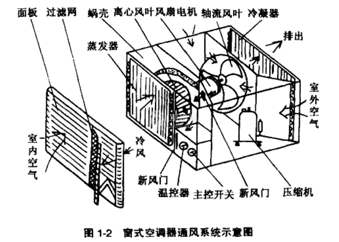 通風的目的是讓室外新鮮空氣(氧氣、濕潤空氣)自然流入,達到室內、外空氣的循環。通風系統包括室內空氣循環系統和室外空氣冷卻系統兩部分,窗式空調器還有一個新風系統,這是分體式與柜式空調器所沒有的,其通風系統結構見圖1-2所示。