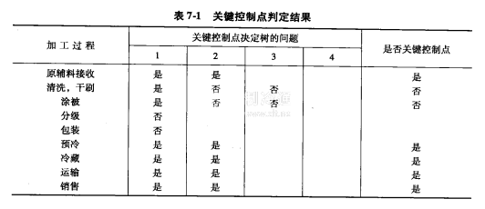 經(jīng)表71分析判斷,確定五個(gè)關(guān)鍵控制點(diǎn):原輔料接收,預(yù)冷,冷藏,運(yùn)輸,銷售。