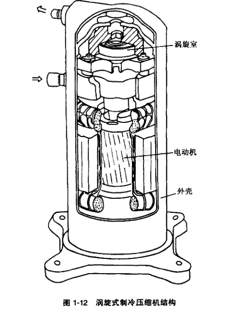渦旋式壓縮機是一類較新型的壓縮機,其制冷壓縮機結構如圖1-12所示,其壓縮機工作原理如圖1-13所示。渦旋式壓縮機主要特點有:①無吸、排氣閥,吸氣壓力損失小,壓縮室壓差小,無余隙容積,容積效率高,可靠性高,功耗小,性能系數COP大;②渦旋回旋運動能形成幾對壓縮腔,因此力矩變化小,振動小,噪聲低;③結構簡單,零部件少,尤其易損件少,體積小,重量輕;④對液擊不敏感;⑤轉速高,有利于實現變頻控制的方式來調節制冷量;⑥采用一種背壓可自動調節的可控推力機構,這樣可保持軸向密封,減少機械損失,防止異常高壓,確保壓縮機安全;⑦便于采用氣體注入循環,從而可提高節能效果,減少壓縮機開、停頻率,控制室溫變化,實現舒適空調;⑧制造、加工精度高,成本較高。總體來說,其綜合性能稍好于滾動轉子式,特別適合于低噪聲要求。目前主要用在大功率高檔先進的空調器上。