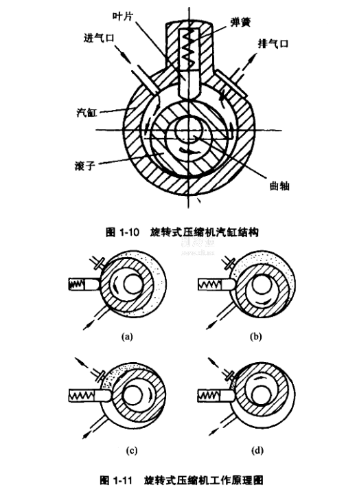 旋轉(zhuǎn)式壓縮機(jī)的工作過(guò)程,見(jiàn)圖1-10和圖1-11所示,圓柱活塞(轉(zhuǎn)子)和葉片靠彈簧的作用緊密相貼,從而在汽缸內(nèi)形成高壓腔和低壓腔兩個(gè)空間。轉(zhuǎn)子每轉(zhuǎn)動(dòng)一周,就完成壓縮一排氣一膨脹一吸氣一個(gè)循環(huán),從而把低溫低壓氣體壓縮為高溫高壓氣體。