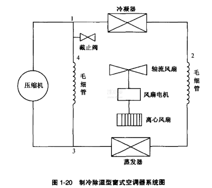這種空調器的特點是增設了一個電磁截止閥與毛細管串聯的回路,見圖1-20中的1-3支路,這條支路實質上是壓縮機排氣管的一條制冷劑旁通路,從壓縮機出來的高壓制冷劑氣體流經1→2→3和1→4→3兩條管路回到壓縮機的吸氣管。當需要除濕時,旁通支路的電磁截止閥導通,使部分制冷劑經除濕毛細管直接流到壓縮機的吸氣口,由于流到蒸發器的制冷劑減少了,蒸發壓力增高,蒸發溫度也相應提高,蒸發器翅片也升高了,設計時只要適當調節除濕毛細管的制冷劑流量與進入蒸發器制冷劑流量的比例,使蒸發器翅片溫度低于空氣露點溫度,即可達到除濕目的。