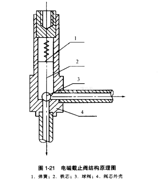 電磁截止閥的原理結構圖如圖1-21所示。當電源接通處于除濕狀態時,電磁截止閥的線圈帶電并使鐵芯產生磁場,鐵芯被吸引上移,帶動球閥把閥門打開;當電源切斷后,磁場消失,鐵芯在自重和推力彈簧的作用下帶動球閥下落,閥門關閉。