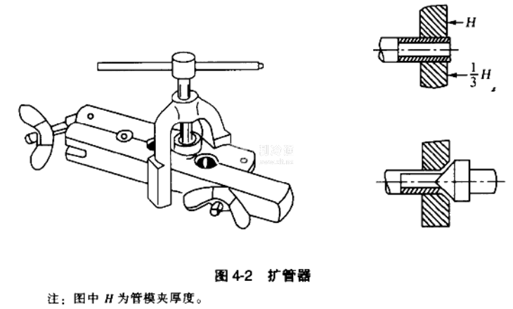 銅管用接頭、接扣連接時,需要用擴管器擴脹喇叭口才能密封。擴管器如圖4-2所示。擴管時先將銅管端部加熱退火,在空氣中冷卻后放入相應的擴管孔中進行擴口。銅管露出擴孔以上的高度應和擴管器下??谛边呴L度相等,擴出的喇叭口應圓整、光滑、無裂痕。