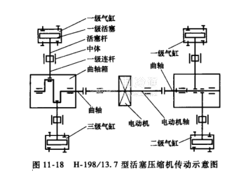 新鋼釩于2006年6月安裝設用了兩臺H-198/13.7型活塞壓縮機。該機型為上海壓縮機有限公司1996年的產品,機組為H形回列對置往復活塞3級空氣壓縮機,傳動軸為三段式,電動機功率1250kW,設計軸功率1248kW,排氣壓力1.37MPa(表壓),設計排氣量198m3/min(大氣常態吸入,溫度30℃,絕對壓力0.0863MPa),各級氣缸直徑分別為830mm、650mm、420mm,活塞行程280mm,主軸轉速428r/min。由于當時的技術水平有限,機組在運行過程中出現了較多的問題,特別是一級排氣溫度達到190℃(進氣35℃)時,盡管采取了定期清洗氣缸冷卻水套和氣體冷卻器等措施,但未能消除壓縮機超溫現象,嚴重威脅機組的安全可靠運行,必須通過更改機組的結構參數才能解決此問題。新鋼釩與上海壓縮機有限公司進行了多次技術交流,提出并實施了改造方案。經改造,機組運行正常,取得良好效果。H-198/13.7型活塞壓縮機傳動示意圖如圖11-18所示。