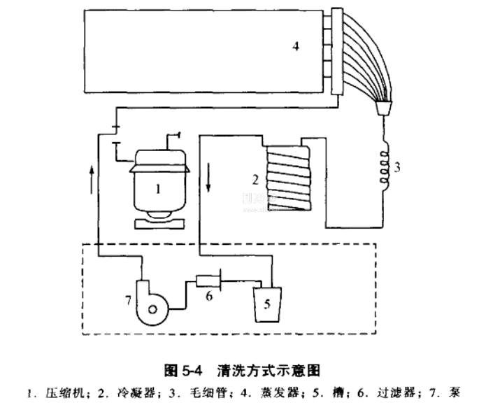 中、小型空調(diào)器使用的制冷劑為R22,清洗劑用R113.清洗過(guò)程如圖5-4所示。