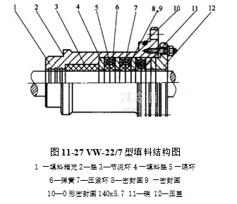 (1) 二級缸填料漏氣填料裝置是壓縮機的重要部件,其主要作用是使氣缸 內(nèi)經(jīng)過壓縮帶有壓力的氣體不能沿著活塞桿向外漏氣,從而維持一、二級缸的壓力 參數(shù)。本機采用浮動平面密封元件的結(jié)構(gòu),由若干小室組成,其中主要由節(jié)流環(huán)、 隔環(huán)、壓緊環(huán)、密封環(huán)、彈簧等組成。兩密封環(huán)之間用銷定位,壓緊環(huán)外用彈簧箍 緊,使密封環(huán)緊貼活塞桿上,則氣缸內(nèi)的壓縮氣體不能向缸外泄漏。圖11-27是 VW-22/7型填料結(jié)構(gòu)圖。