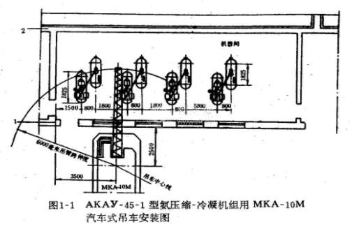 AKAY-45-1型氨壓縮-冷凝機組用MKA-10M汽車式吊車安裝圖如圖1-1。