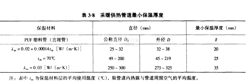 3)當(dāng)供熱熱媒與采暖管道周圍空氣之間的溫差等于或低于60℃時(shí),安裝在室外或室內(nèi)地溝中的采暖供熱管道的保溫厚度不得小于表3-8中規(guī)定的數(shù)值。