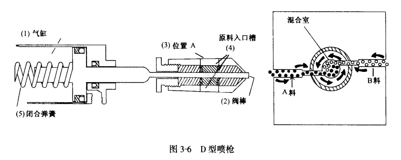 圖3-6所示噴槍處在閉槍狀態(tài),啟動設(shè)在槍柄處的空氣閥門開關(guān),氣缸內(nèi)的壓縮空氣就會把閥棒推向前端的位置A,當(dāng)閥棒前端退經(jīng)A與B原料進(jìn)口槽時,由閥棒占據(jù)的混合室,此時已空出,原料便從進(jìn)口槽以高壓沖出。由于兩組原料進(jìn)口槽不在同一水平線上(出口不相對),因此原料從槽中沖出時是以一種高壓渦旋式?jīng)_擊混合,碰擊時的渦旋運(yùn)動能產(chǎn)生足夠強(qiáng)的離心力使混合液體霧化并從混合室噴出。