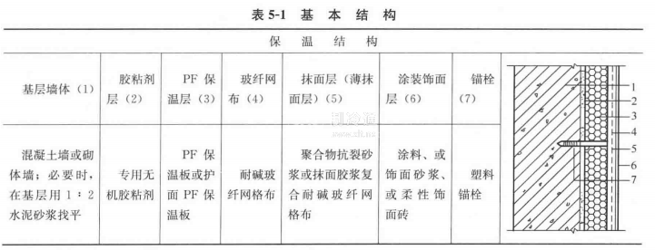 粘貼酚醛泡沫板涂裝飾面外墻外保溫系統基本結構示意,見表5-1。