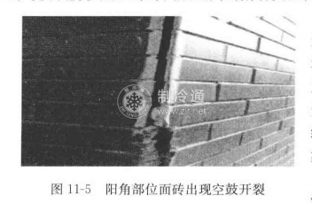 常見面磚掉落通常是成片發生,且多在墻邊緣和頂層建筑女兒墻沿屋面板的底部,以及墻面中間大面積空鼓部位,主要受溫度影響而發生脹縮時,產生累加變形應力將邊緣(陽角)面層的面磚擠掉或中間部分擠成空鼓、裂縫,某樓面磚飾面在陽角部位出現空鼓開裂現象,如圖11-5所示。