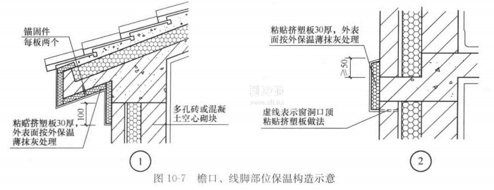 檐口、線腳部位保溫構(gòu)造,應(yīng)采取外保溫方式(如粘貼PF保溫板或擠塑板),防止產(chǎn)生熱橋,如圖10-7所示。