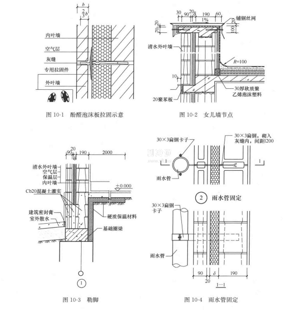 9)墻體應(yīng)設(shè)計耐火極限。夾芯墻酚醛泡沫保溫板緊密銜接、緊貼內(nèi)葉墻墻。外葉墻內(nèi)側(cè)的空氣層厚度不宜小于20m,拉結(jié)鋼筋網(wǎng)片或拉結(jié)件應(yīng)壓入保溫板內(nèi)(夾芯墻采用現(xiàn)場注入酚醛泡沫發(fā)泡保溫材料時,夾芯層不設(shè)空氣層)。