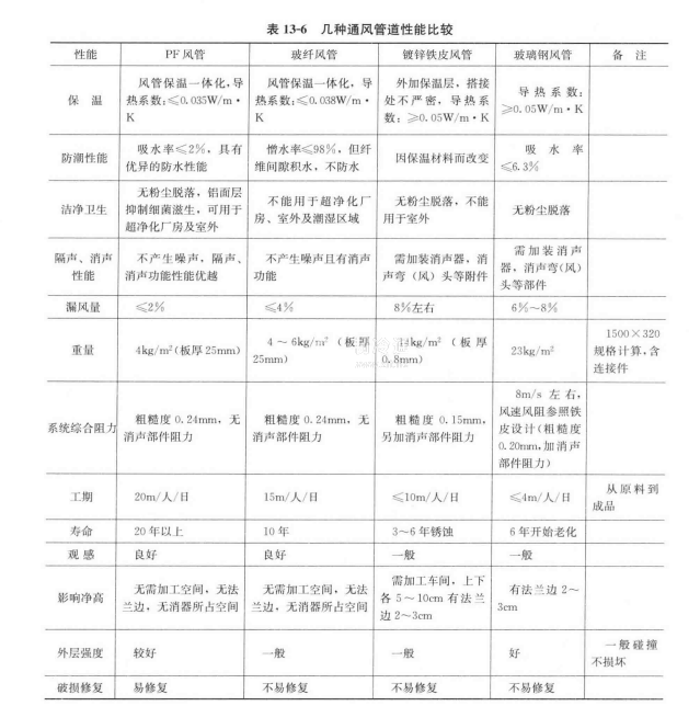 (9)PF通風管道(簡稱酚醛泡沫風管)與玻纖風管、鍍鋅鐵皮風管及玻璃鋼風管之間性能比較,見表13-6。