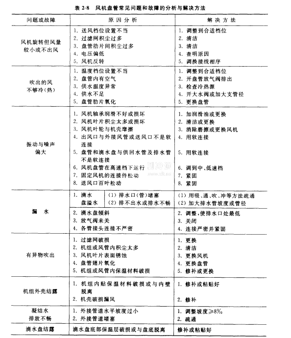 風機盤管的使用數量多、安裝分散,維護保養和檢修不到位都會嚴重影響其使用效果。因此,對風機盤管在運行中產生的問題和故障要能準確判斷出原因,并迅速予以解決。表2-8歸納的常見問題和故障的分析與解決方法可供參考。