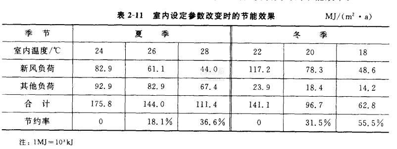 從表中可以看出,夏季室溫從24℃提高到28℃,冷負荷可以減少36.6%:冬季室溫從22℃降到18℃,熱負荷可以減少55.5%。某建筑物內的商場,當夏季室溫從26℃提高到28℃,冬季室溫從20℃降到18℃時,分別可以節(jié)約23%的冷量和35%的熱量。