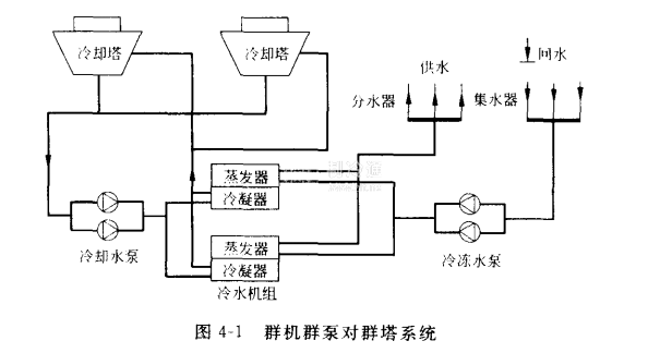 ①冷水機組、水泵、冷卻塔分類并聯然后連接組成的系統,簡稱群機群泵對群塔系統,如圖4-1所示。