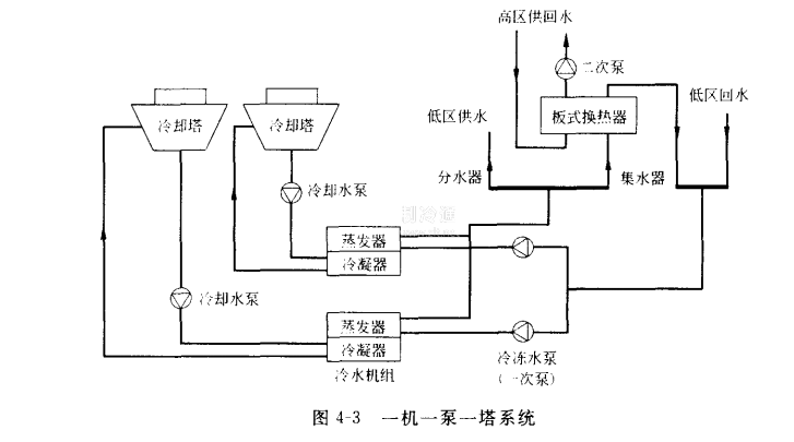 ③冷水機組、水泵、冷卻塔一一對應分別連接組成的系統,簡稱一機一泵一塔系統,如圖4-3所示。