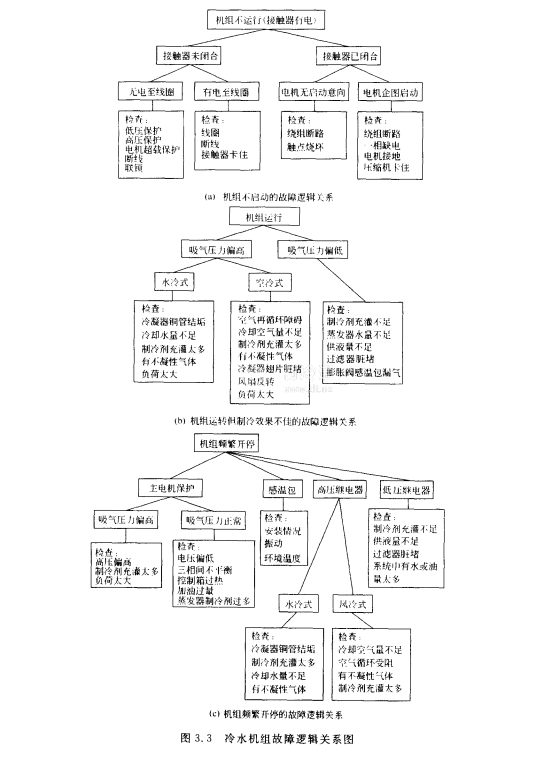 ③根據冷水機組技術故障的邏輯關系進行數據和資料分析。冷水機組技術故障的邏輯關系及檢查方法是用于分析和檢驗各種故障現象原因的有效措施。把各種實際采集到的數據與這一邏輯關系聯系起來,可以大大提高判斷故障原因的準確性和維修工作進展的速度。通常把冷水機組運轉中出現的故障分為三類:①機組不啟動;②機組運轉但制冷效果不佳;③機組頻繁開停。各類故障的邏輯關系如圖3.3所示。