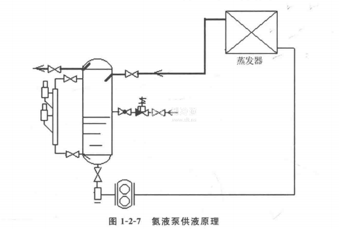 液泵供液是借助液泵的機械功來克服管道阻力及靜壓力向蒸發器強行輸送制冷劑液體。其工作原理如圖1-2-7所示。在該系統中以低壓循環桶代替了重力供液的汽液分離器,高壓液體經節流后進入低壓循環桶,在桶內分離掉閃發汽體后經液泵送入蒸發器吸熱蒸發,汽化生成的蒸汽和沒有汽化的液體一起經回汽管返回到低壓桶再次被分離,汽體連同節流生成的閃汽進入吸入管回到壓縮機,而液體匯同新補充來的液體供液泵再循環。