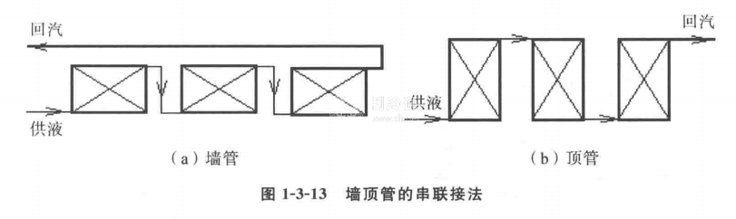 ①串聯俗稱“一條龍”連接方式,液泵供液方式的墻管與墻管,頂管與頂管之間的連接均可優先采用這種串聯方式,以提高管內流速,增強傳熱效果,如圖1-3-13所示。
