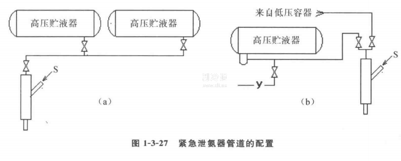 在氨制冷裝置中,緊急泄氨器應與貯氨較大的容器,如貯液器、低壓循環(huán)桶、蒸發(fā)器等設備的底部接通,如圖1-3-27所示。