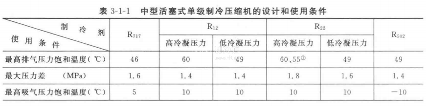 (三)選用壓縮機的工作條件不得超過制造廠規定的使用條件,新近制定的國產活塞式制冷壓縮機的極限工作條件見表3-1-1和表3-1-2。