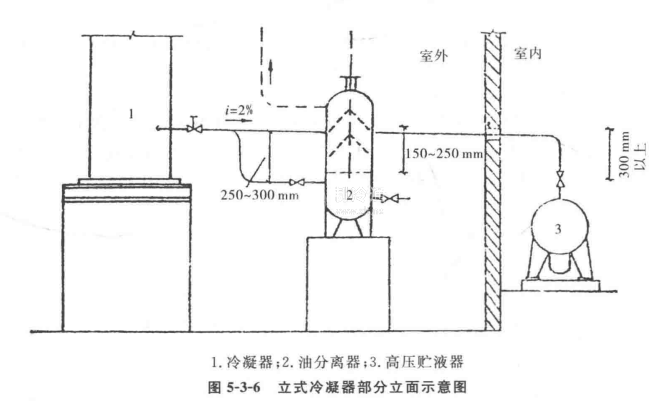 油分離器的位置要同管道走向一起考慮,要使從壓縮機(jī)到冷凝器的排氣管走向順暢少彎,并盡量靠近冷凝器。對于洗滌式油分離器,在布置時應(yīng)注意高度的要求,因為當(dāng)壓縮機(jī)工作時,油分離器中的壓力比貯液器內(nèi)的壓力高(冷凝器及管道中阻力損失引起壓力差)。因此,油分離器的進(jìn)液管標(biāo)高,應(yīng)比冷凝器出液管標(biāo)高低300mm,并從冷凝器出液集管的底部接出,見圖5-3-6。必要時,可設(shè)置液包,以便保證供液,其他形式的油分離器,無安裝標(biāo)高的要求。