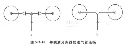當(dāng)系統(tǒng)中選用兩個以上的油分離器時,壓縮機(jī)至油分離器的排氣支管應(yīng)采用變徑管圖5-3-10(a)或羊角彎連接圖5-3-10(b)以保證氣流分配均勻,提高分油效果。