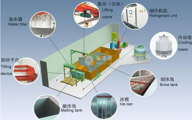 鹽水制冰是采用全敞開式間接冷卻方式來制取冰塊,我國70年代以前興建的冷庫中絕大部分是采用這種制冰設(shè)備。雖然鹽水制冰設(shè)備占地面積大,耗用金屬材料多,且維修費(fèi)用高。但是由于制出的冰塊堅(jiān)實(shí)不容易融化,易于碼垛貯存和滑運(yùn)輸送。所以,目前制冰量較大的冷庫或制冰廠,特別是水產(chǎn)冷庫,仍多采用鹽水制冰設(shè)備制冰。