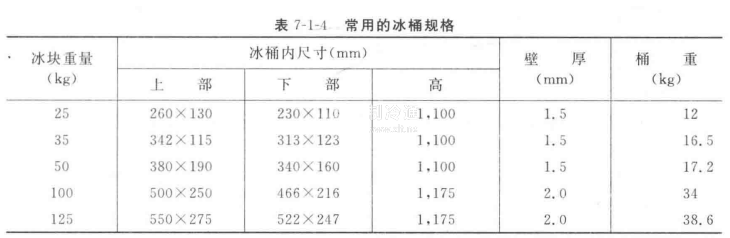 冰桶一般用1.5~2.0mm厚的鋼板制成。桶的上下兩端均有鋼板箍加固,為了加快結冰時間和便于脫冰,冰桶應制成上口大、下口小的矩形斷面,容量較大的冰桶,還應在寬壁面上沿豎向壓制一條加強凹槽。為了防止結冰時因水膨脹使冰桶受壓變形和桶內淡水濺到冰池中,桶內裝水不宜過滿。常用的冰桶規格見表7-1-4。