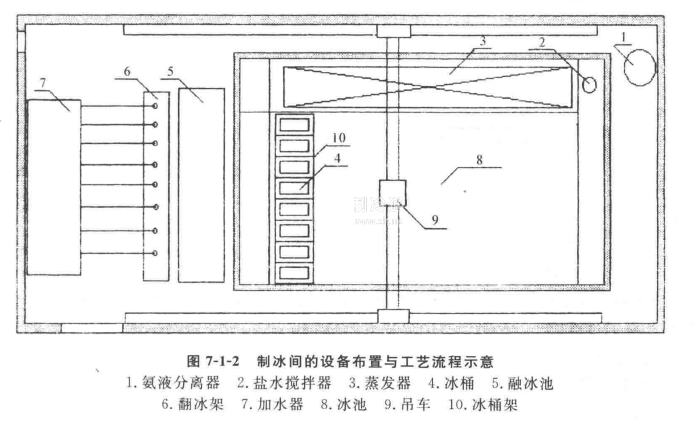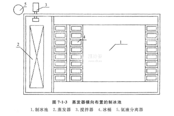 (1)橫向布置 將蒸發(fā)器布置在冰池的一端。鹽水呈橫向流動(dòng),如圖7-1-3。特點(diǎn)是鹽水流程短,鹽水溫度均勻,結(jié)冰時(shí)間相差不大,但鹽水流向平行于冰桶的短邊,熱交換較差。