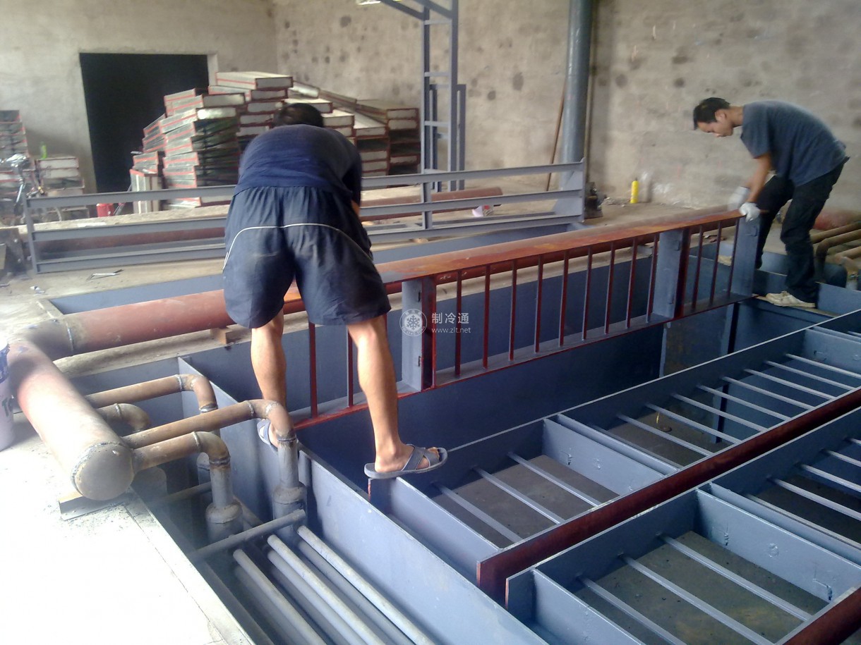 (1)制冰池的結構 制冰池體(又稱鹽水槽)是用6~8mm厚的鋼板焊制而成,其四周底部常以150~120mm厚的軟木為隔熱層,并在隔熱層外表設防潮層。池上面蓋有50~60mm厚的木蓋,有條件者可雙面焊接鋼板。為了加強剛性,避免板壁凹凸不平,在冰池的側板上常加焊適量型鋼來加固。在冰池的上部,焊有擱置蓋板和冰桶架的支架,同時又可加強池子的剛性。冰池內焊有將蒸發器和制冰池隔開的隔板,在鹽水道內還設有導流板,以便調整鹽水流速均勻。為了防止地坪凍鼓,可在池底設通風管或做地墻架空。