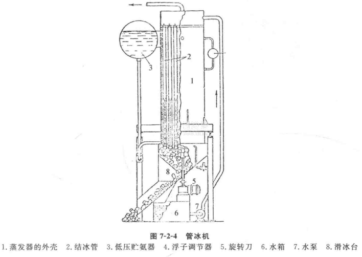 管冰機的結構如圖7-2-4所示,主要由蒸發器、低壓貯液器、水泵、水箱、旋轉刀片等組成。蒸發器為直立殼管式,其結構為3~4m高的鋼制直立圓筒,兩端有封板,之間焊有多根通徑為50mm的無縫鋼管(即制冰管)。制冷劑在制冰管外蒸發制冷,制冰水從上部經分配器沿管子內壁呈薄膜狀往下流動而被冷卻。開始時為冰殼,并逐漸加厚形成冰管,全部凍好的冰柱大約在40min內形成,由于制冰之水在不斷循環,使其中的空氣被排除,因而制出的冰為透明而密實。